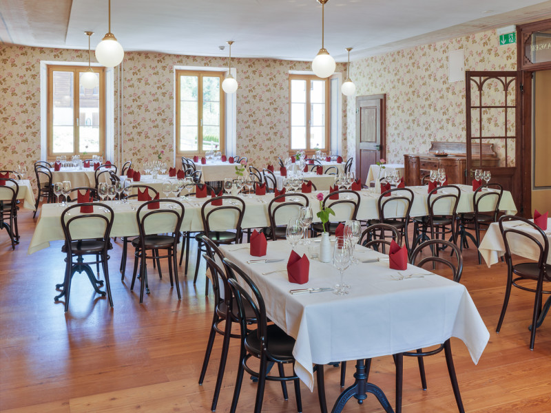Unser stilgerecht restaurierter Speisesaal – die Salle à manger – versprüht mit seiner Rosentapete und den originalen Deckenmalereien wieder den Charme der Belle Époque. Er bietet die ideale Kulisse für Kulturanlässe, Geburtstagsfeste, Jubiläumsfeiern, Hochzeiten und andere festliche Anlässe. In unserer Salle à manger haben bis zu 80 Personen Platz.