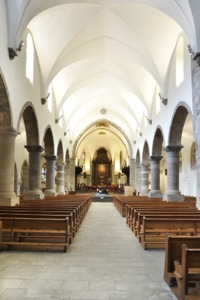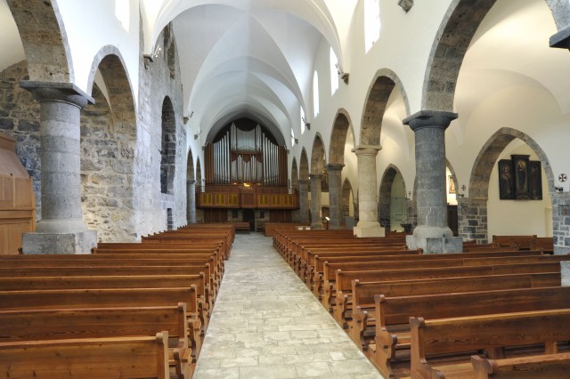 En entrant, le visiteur est frappé par le rythme donné par les arcs gothiques et leurs colonnes qui sont en partie des éléments récupérés d’églises plus anciennes. La colonnade ouest est interrompue par la tour romane présentant l’entrée de l’église du 11e siècle.