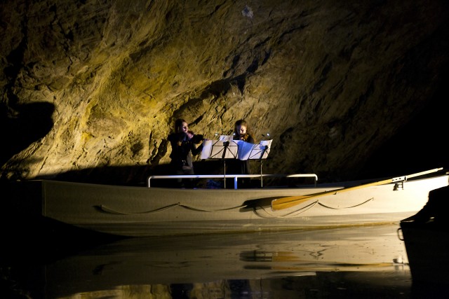 Le lac souterrain est un site naturel qui bénéficie d'excellentes qualités acoustiques. Quatre embarcations peuvent accueillir 120 personnes pour assister aux évènements qui se tiennent à l'intérieur de la grotte.