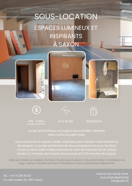 Vous cherchez un espace dédié, inspirant, pour exercer votre activité ou développer un projet professionnel. Nous proposons la sous-location d’une salle indépendante dans notre école de cirque, à 2 minutes de la sortie d'autoroute et 20 minutes de la gare.